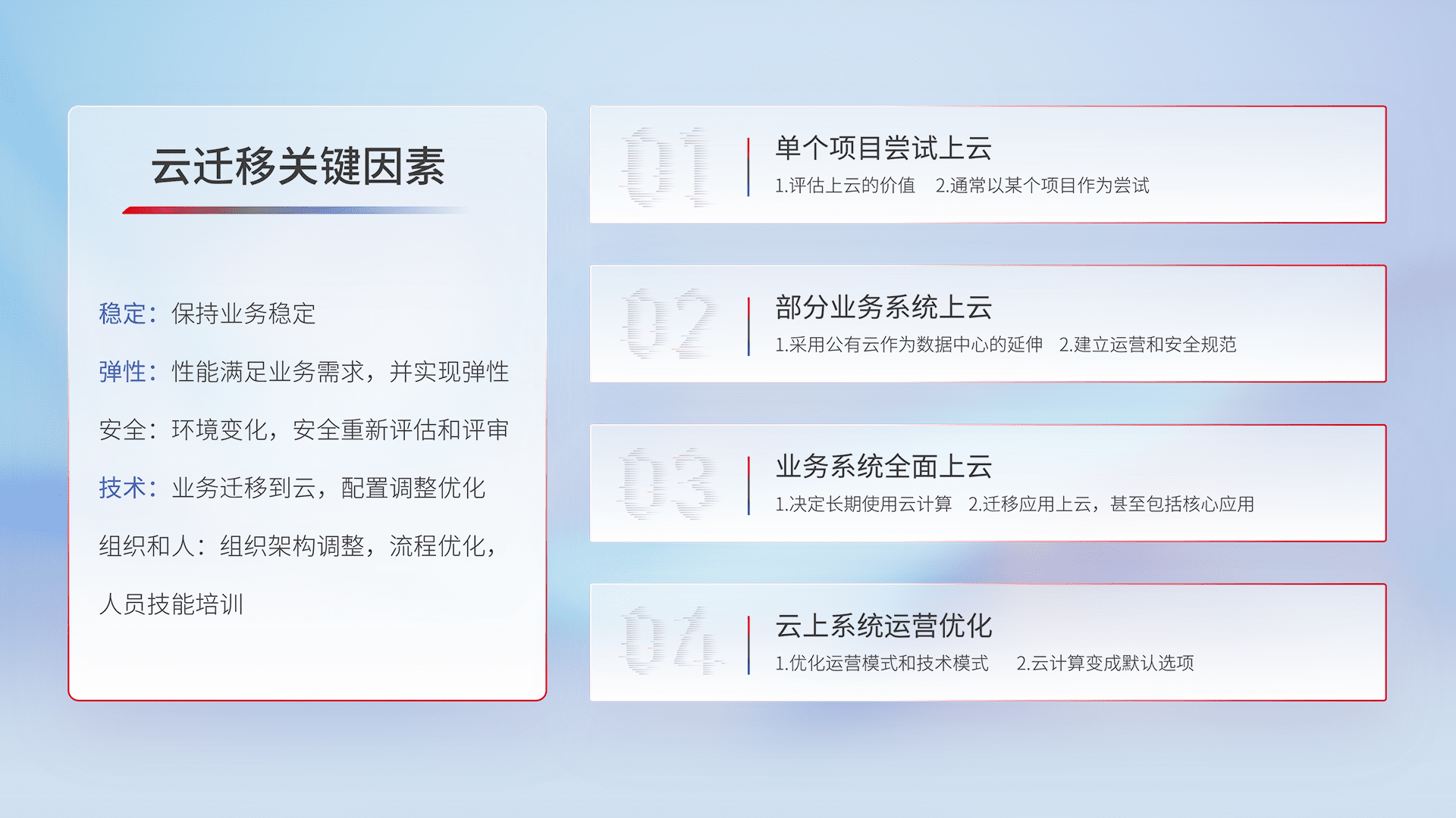 结合实际业务,,,,从规划设计、、、云平台选型、、云原生改造、、、、数据迁移、、、、集成交付,,,,迁移全过程为客户识别最佳上云路径,,做好风险识别管理,,,设计网络架构、、、身份权限、、、安全审计合规、、操作审计、、日志审计、、、监控告警策略、、、多站点容灾设计等,,对云上基础设施进行整体规划,,提升IT治理水平,,,以满足弹性、、、、高可用、、、、高性能的需求。。