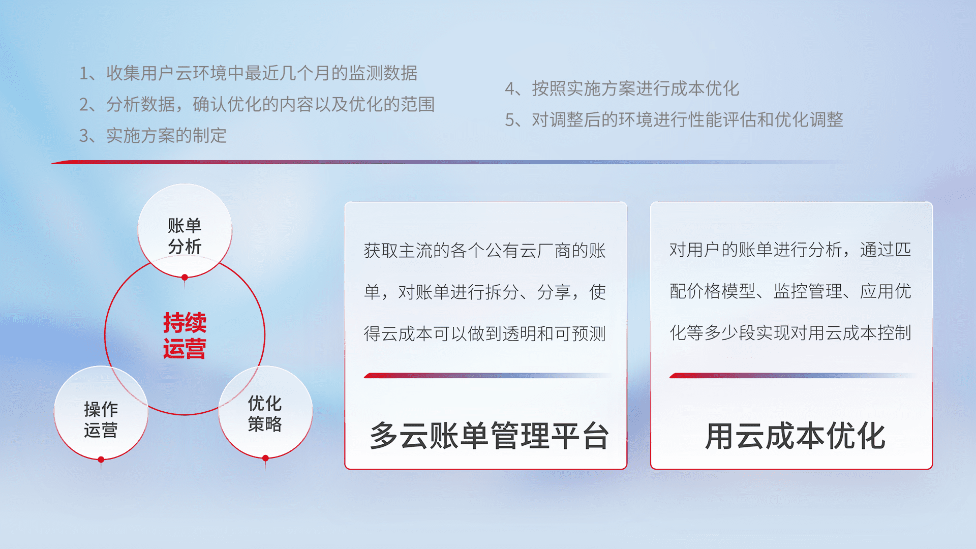 通过多云纳管,,,,以统一的资源数据模型把客户的云资源进行抽象和封装,,,进而实现对多云资源的统一操作,,保障云资源管理的可靠性、、、稳定性与可用性。。。量身定制化运维内容,,,,配置、、开发运维、、、补丁管理、、、、备份、、监控、、、、认证和访问管理、、审计和日常巡检等,,保障在用云过程中的可靠度,,,稳定度以及高可用率。。